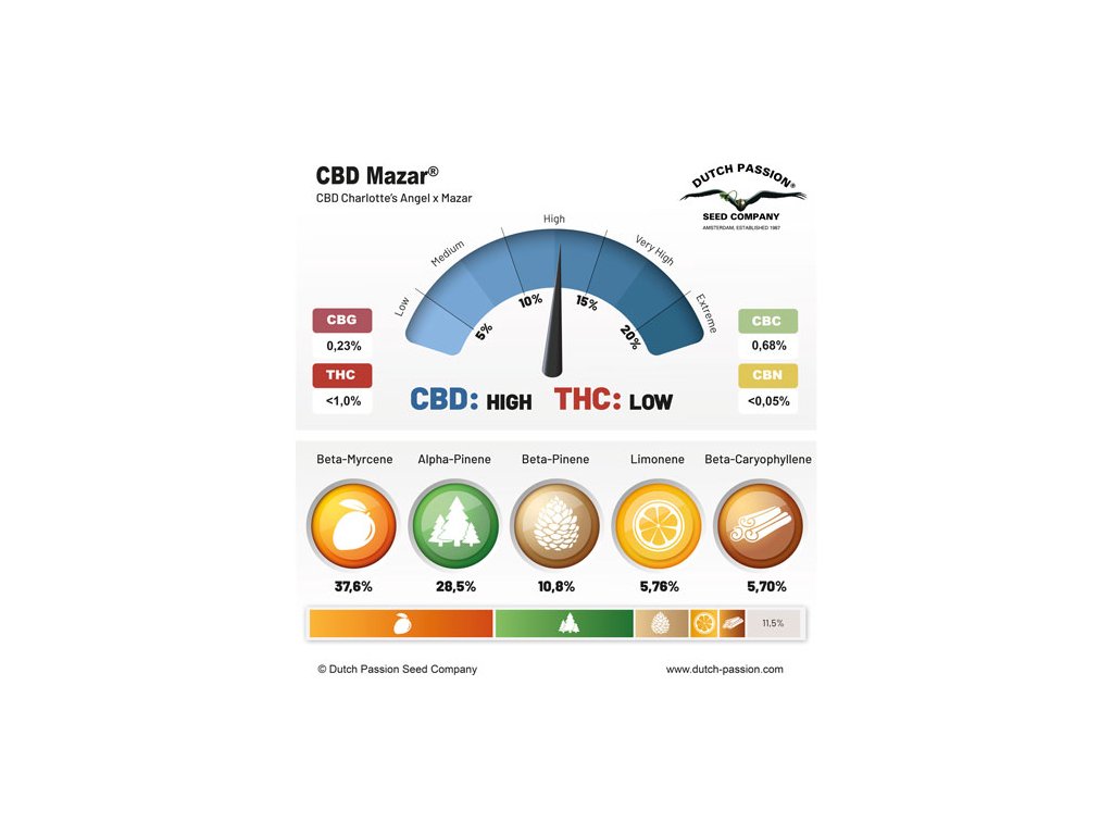 Obsah CBD v CBD Mazar je o něco nižší než v CBD Charlotte’s Angel, jelikož CBD Mazar vyprodukuje obvykle v průměru 10 až 13 % CBD. Obsah THC je každopádně vždy pod 1 % - v průměru ukazovaly testy na hodnoty mezi 0,4 až 0,5 % THC.